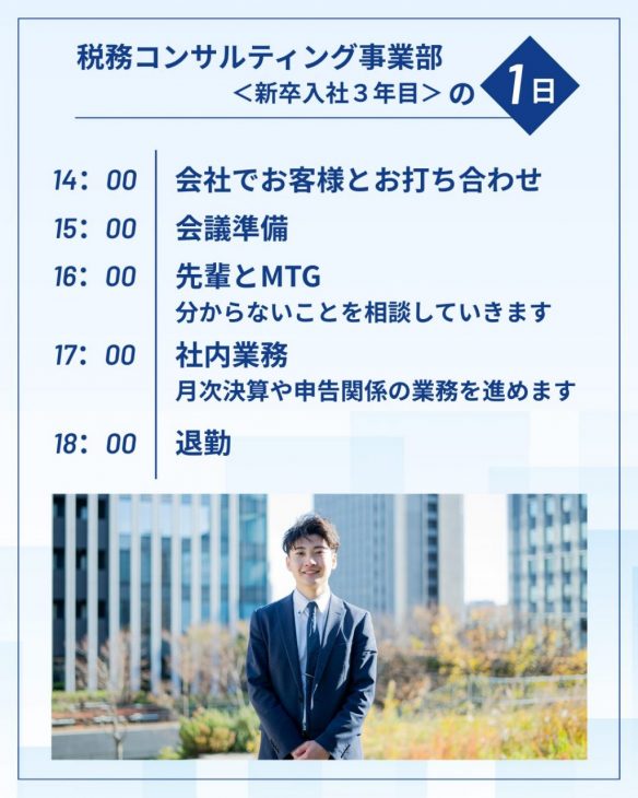 税務コンサルティング事業部社員〈新卒入社3年目〉1日の流れをご紹介