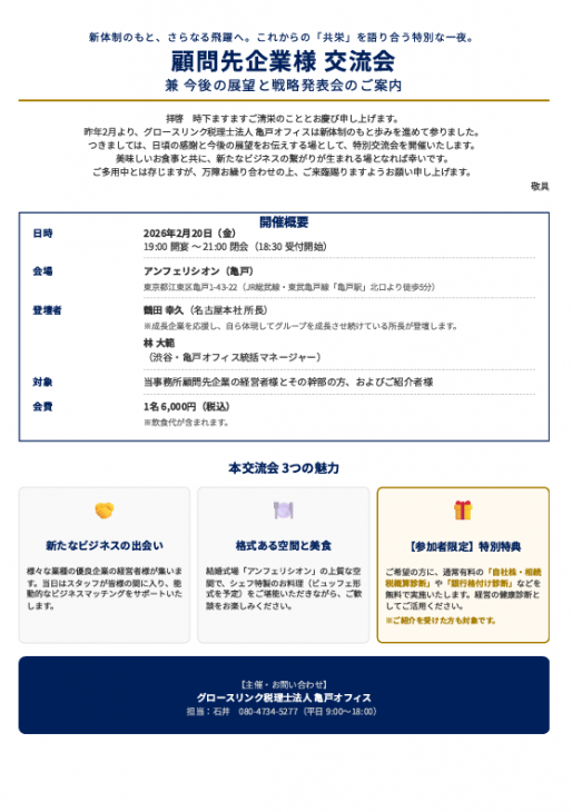 顧問先企業様への日頃の感謝と今後の展望をお伝えする場として、交流会を開催いたします。