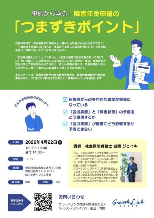 本セミナーでは、障害年金専門の社会保険労務士が、最新の審査動向や認定基準をふまえ、「これだけは押さえておきたい」実務のポイントを解説します!
